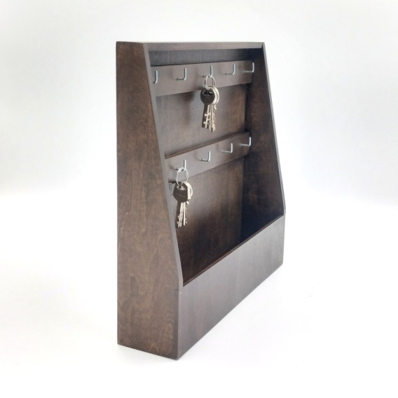 Bardzo prosta, praktyczna skrzynka na klucze. Bez drzwiczek, zawsze otwarta. Wieszanie kluczy jest maksymalnie ułatwione. Po prostu sięgasz i masz klucze. W skrzynce znajdują się 2 rzędy po 5 haczyków. W głębokim schowku możesz trzymać dokumenty, paragony i inne drobiazgi. Skrzynka wykonana ze drewnianej sklejki i pomalowana na ciemny brąz (wenge) ekologiczną farbą. Idealnie pasuje zarówno do nowoczesnych jak i klasycznych wnętrz, holów, warsztatów, pracowni.