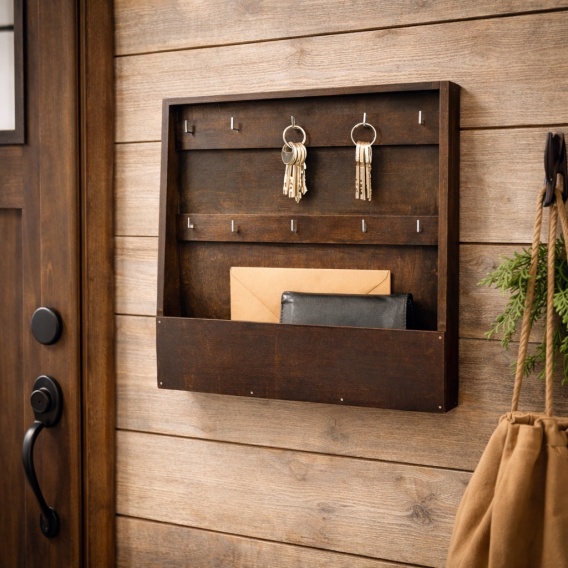 Bardzo prosta, praktyczna skrzynka na klucze. Bez drzwiczek, zawsze otwarta. Wieszanie kluczy jest maksymalnie ułatwione. Po prostu sięgasz i masz klucze. W skrzynce znajdują się 2 rzędy po 5 haczyków. W głębokim schowku możesz trzymać dokumenty, paragony i inne drobiazgi. Skrzynka wykonana z drewnianej sklejki i pomalowana na ciemny brąz (wenge) ekologiczną farbą. Idealnie pasuje zarówno do nowoczesnych jak i klasycznych wnętrz, holów, warsztatów, pracowni.